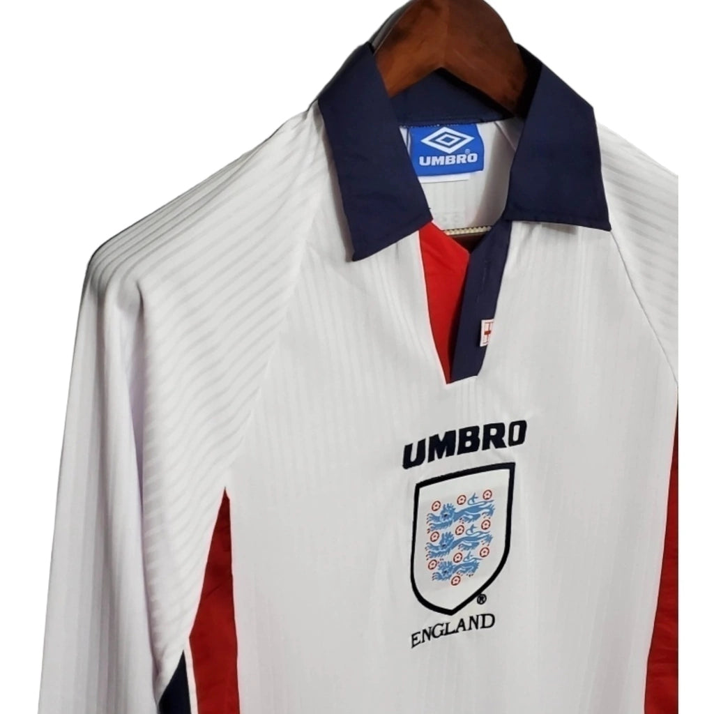 Camisa Retrô Seleção da Inglaterra I 1998 manga longa - Masculina - Branca com detalhes em azul e vermelho